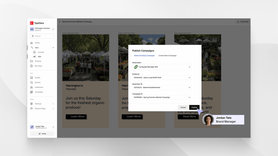 Seamless Campaign Management – Directly integrate Typeface-generated assets into Campaign Manager 360, ensuring consistent and high-quality visuals across channels while maintaining creative intent.