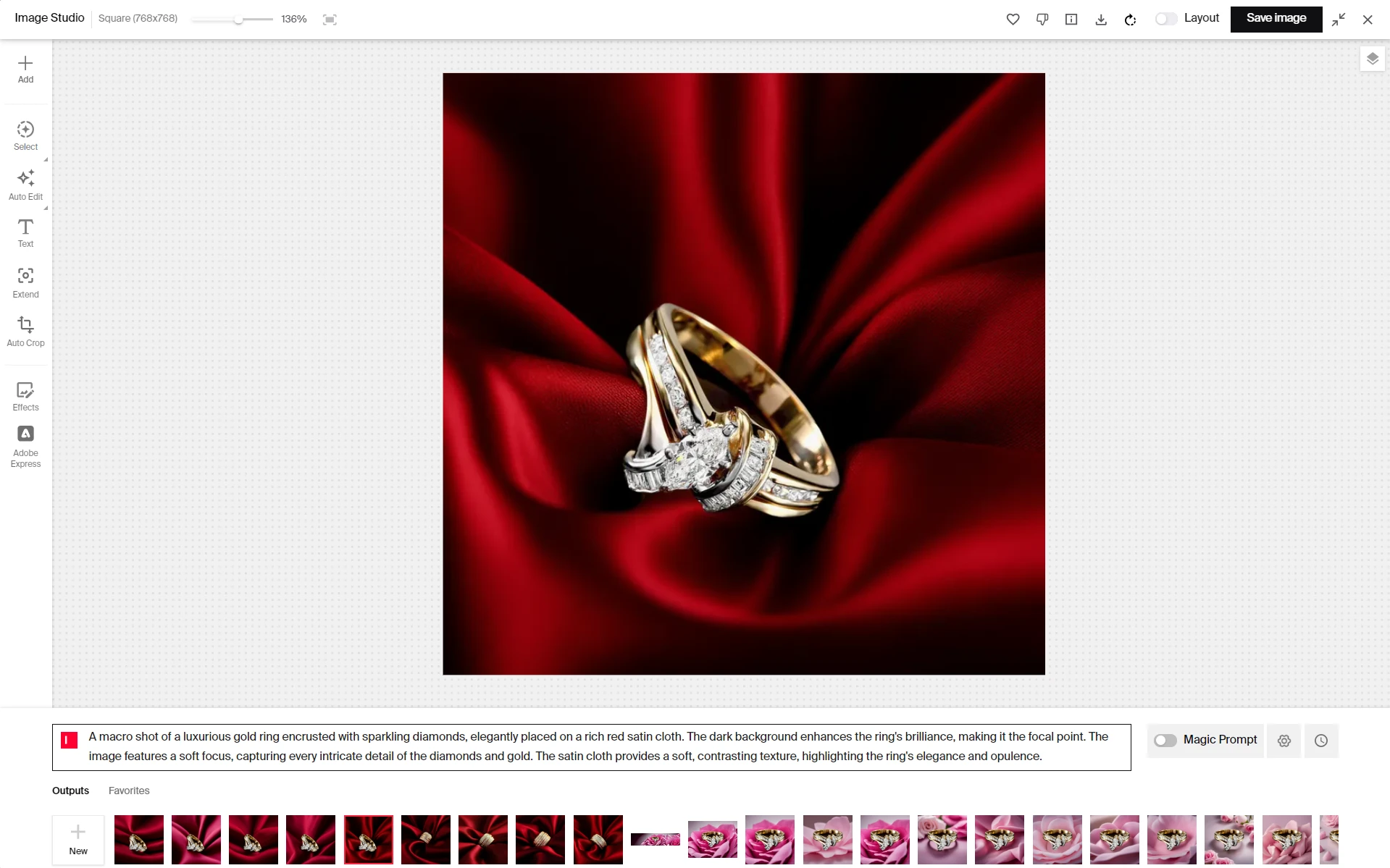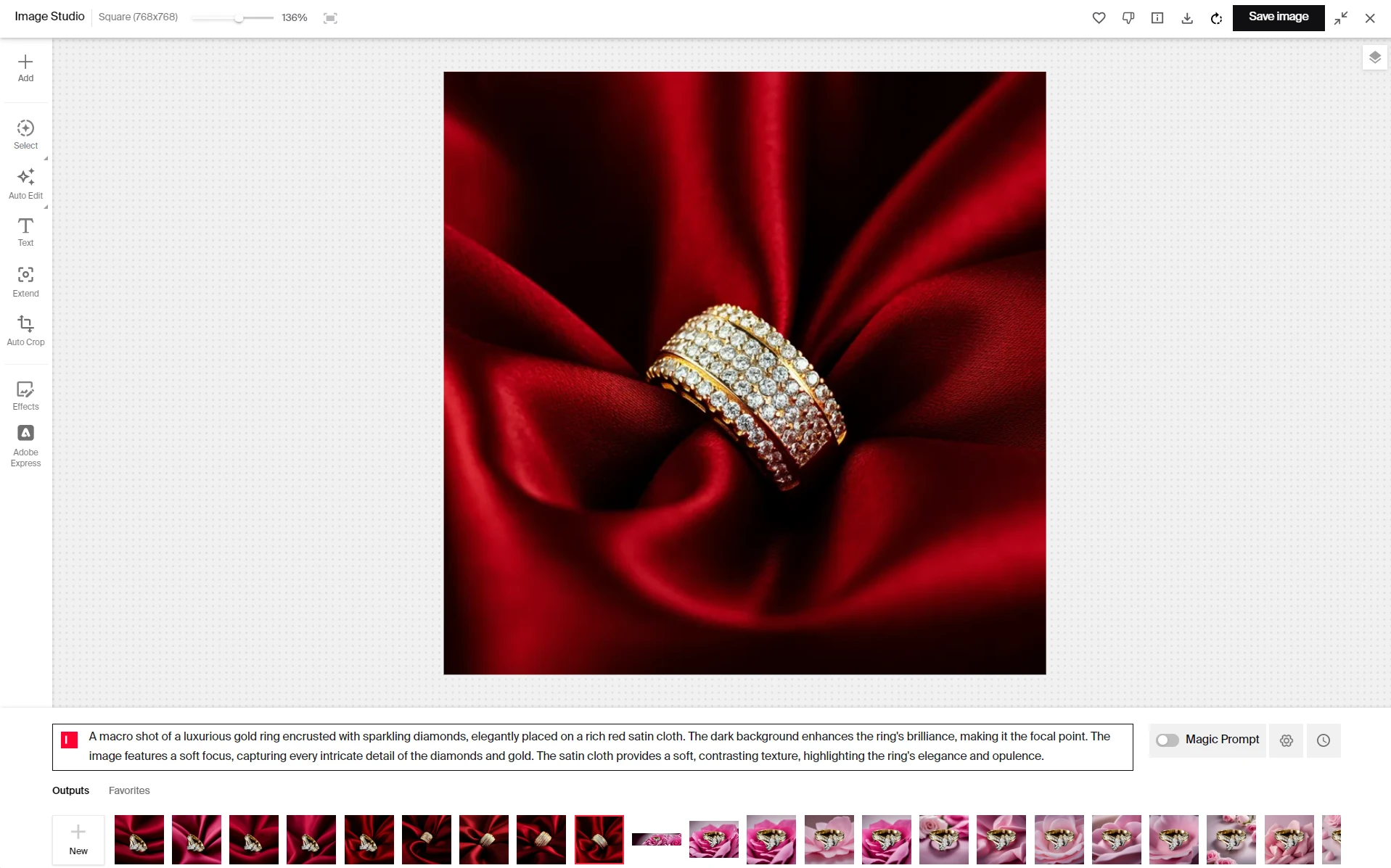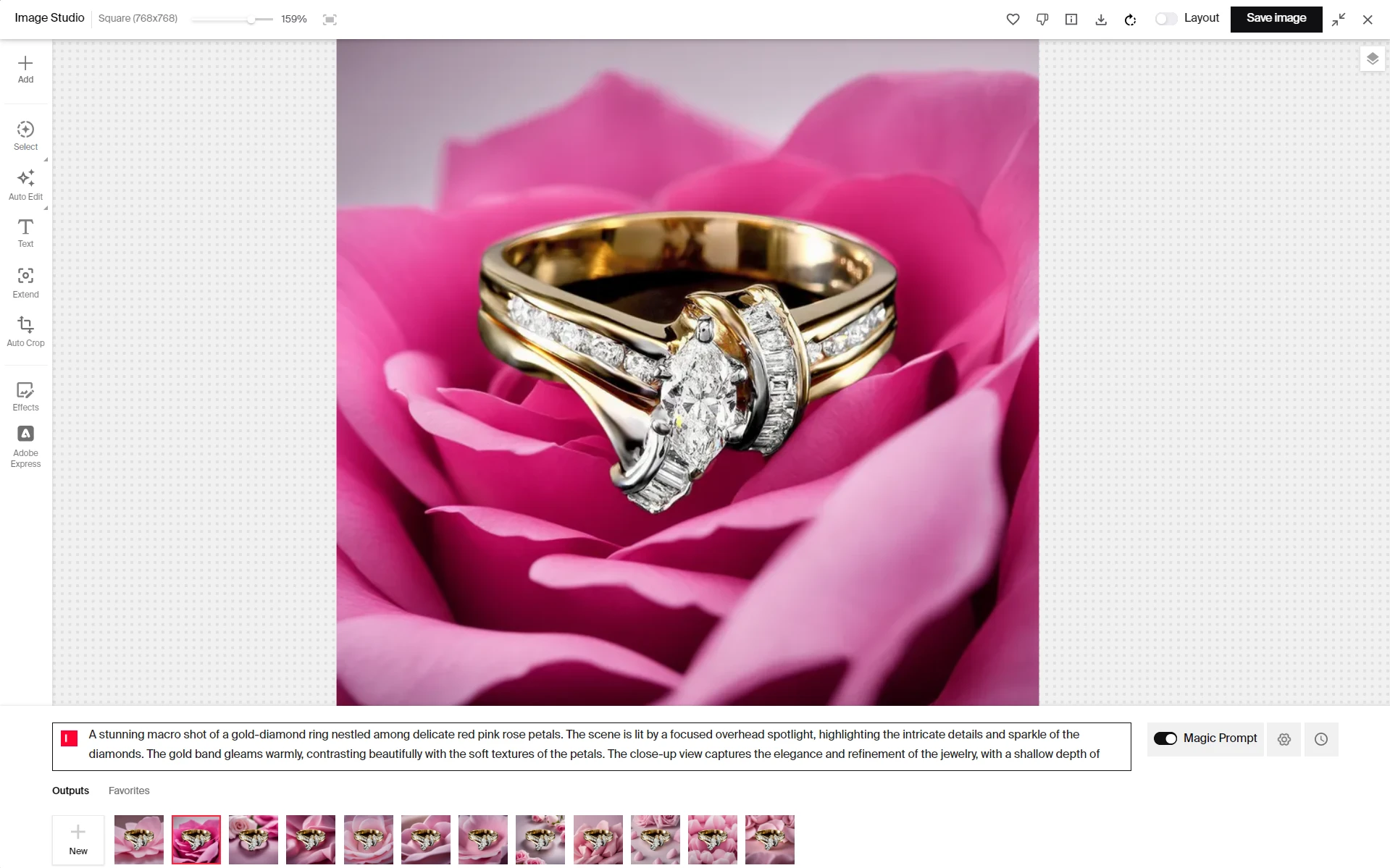 Here’s an example. We wanted a macro shot of a diamond ring and wanted to experiment with different backgrounds for the image. So, we added the asset to Typeface’s Image Studio and added a simple prompt: “Macro shot of a gold-diamond ring placed amid pink rose petals”. Then, with “Magic Prompt” on, we let the AI generate a few options.