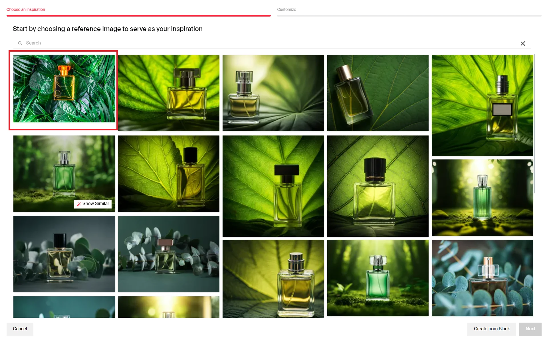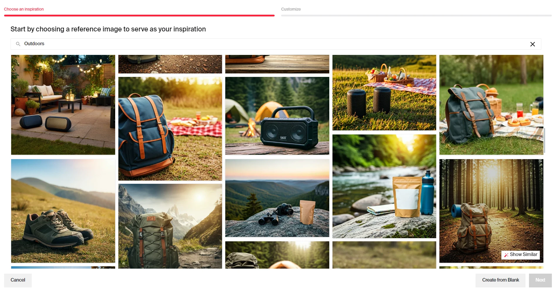 The Inspiration Flow on Typeface is a great place to start your AI product photography journey. Inspiration Flow offers you a host of reference images in various settings that you can use as inspiration to generate your own unique product shots. The inspiration library has various categories of ideas like "outdoors", "simple studio shot", "ingredients" and others.