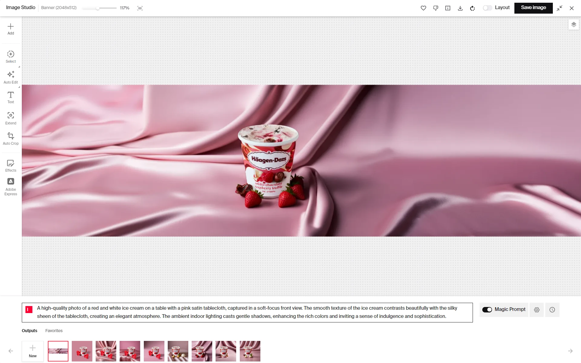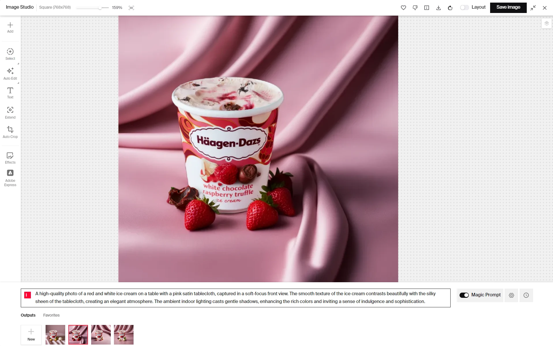 Now that your styling is done, add a prompt describing how or where you want the product placed. Typeface already understands the product and props that you want to use, so you can simply start your prompt as "on a table with a pink satin tablecloth", for instance. Remember to turn on “Magic Prompt” so Typeface’s AI can automatically enhance your input to generate a higher quality output for the image.