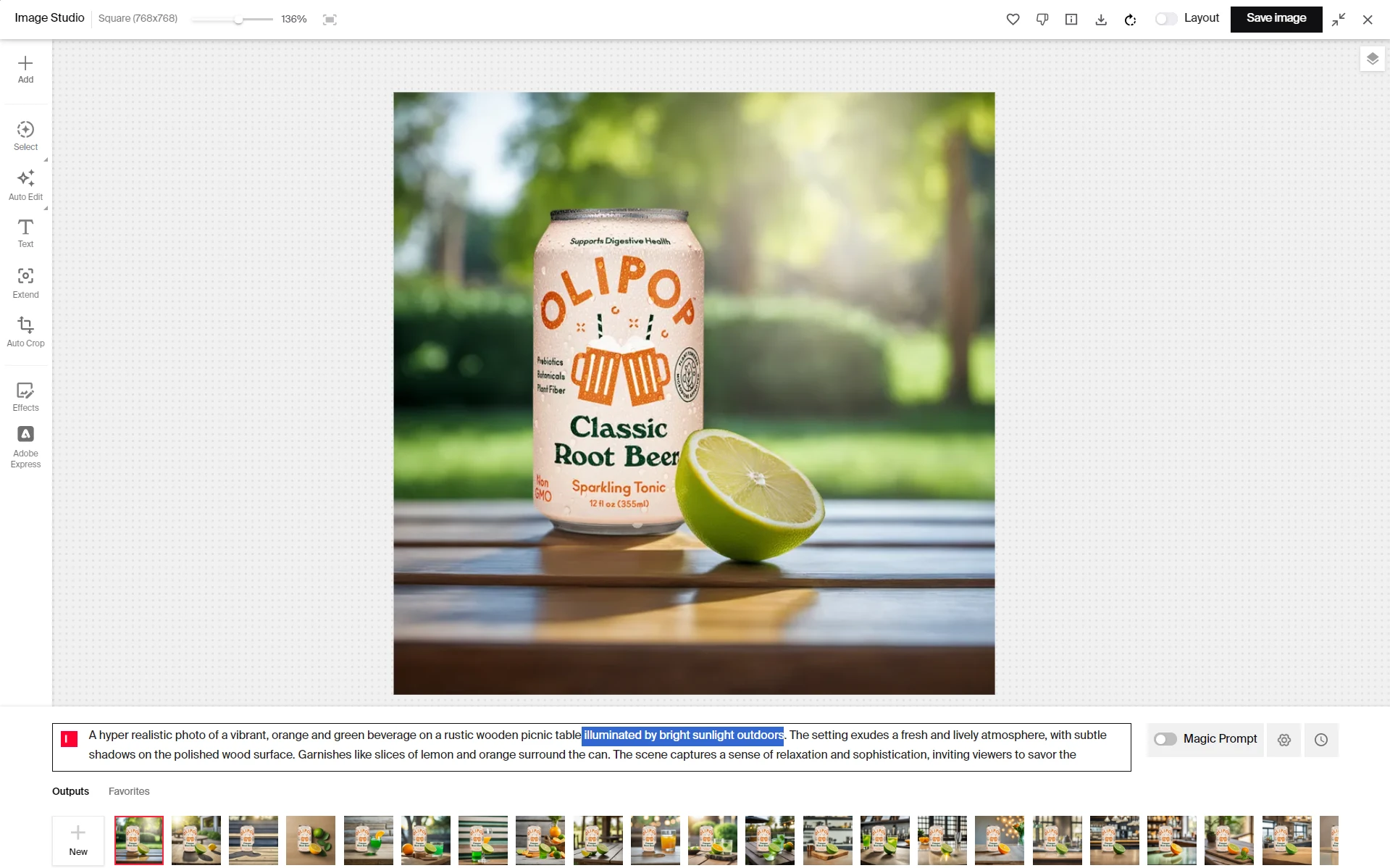 For the next shot, we wanted an outdoor setting and changed the prompt to include “bright sunlight outdoors”. And the AI generated multiple variations of the same image with the new mood lighting preferences.