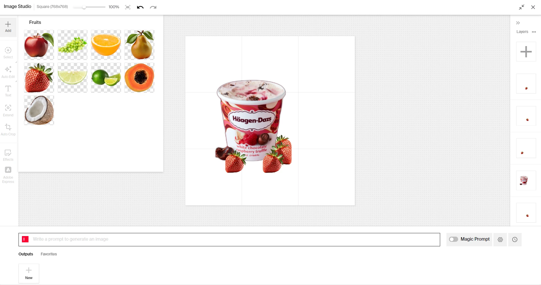 Then, add decorations. You can choose from the existing decorations in Typeface’s Image Studio, like platforms, fruits, plants, home decor, or upload your own decorations. The AI background remover can erase the background for these assets too. You can also move and resize the decorations to get the perfect layout.