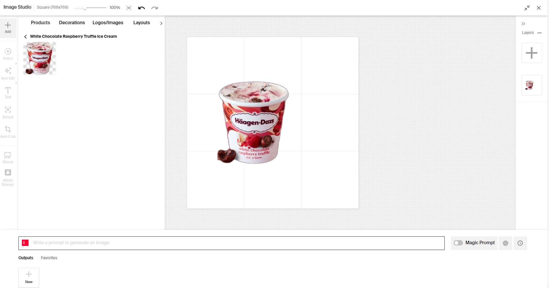 To add your own props and styling elements on product photos on Typeface, go to Image Studio and start with a blank canvas. Add your product assets, and the AI background remover on the platform will give you a product image without the background. Now add this product image to the canvas and position and resize it to your liking.