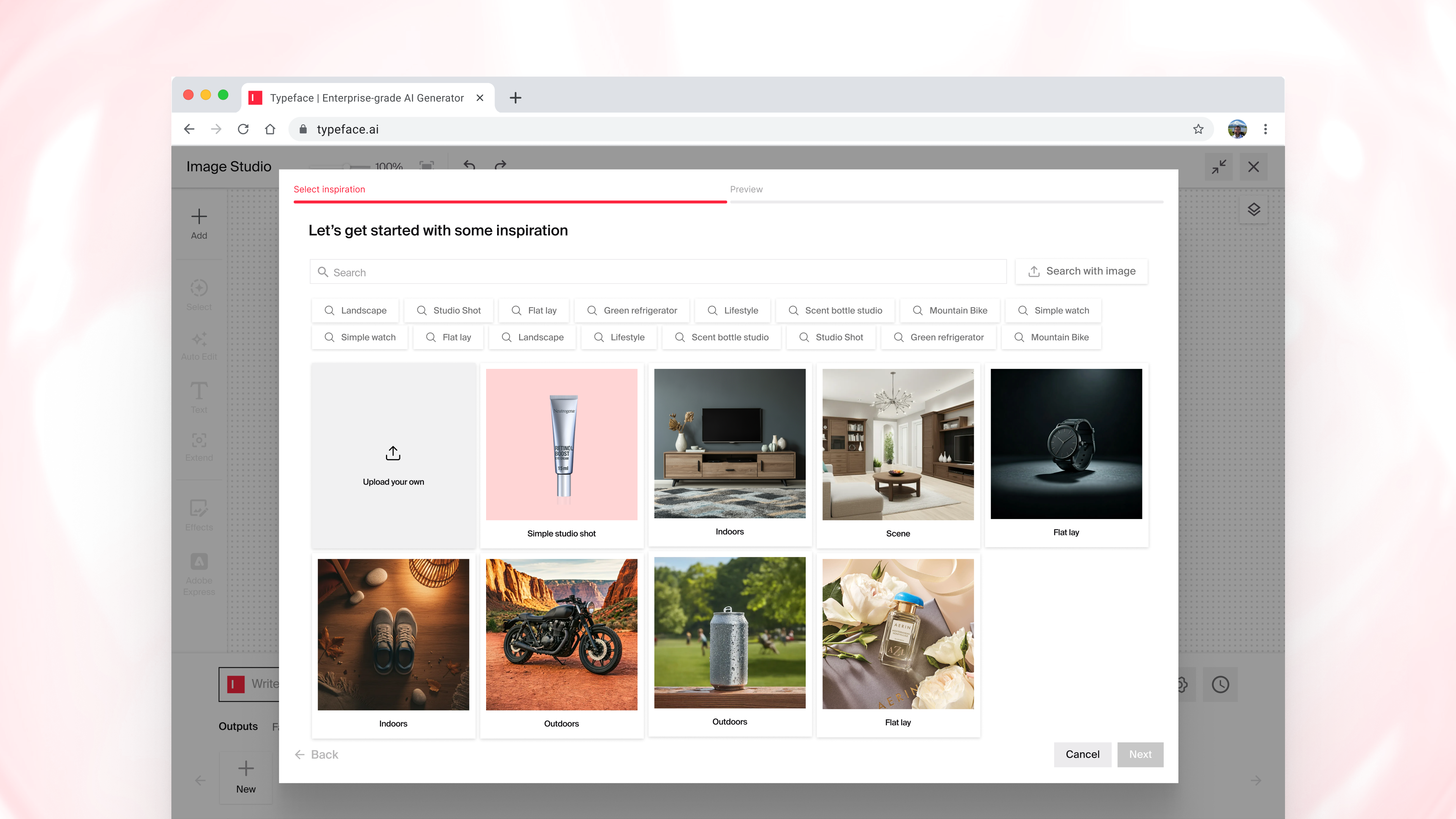 Visual inspiration studio: Eliminating the "blank canvas" problem, Typeface offers a library of brand-specific image sets that you can personalize to your brand and audiences. You can also leverage your existing library and using our rich semantic search, find the right inspiration faster – no manual tagging required. This AI visual inspiration studio accelerates ideation for campaigns and web designs while maintaining brand integrity.