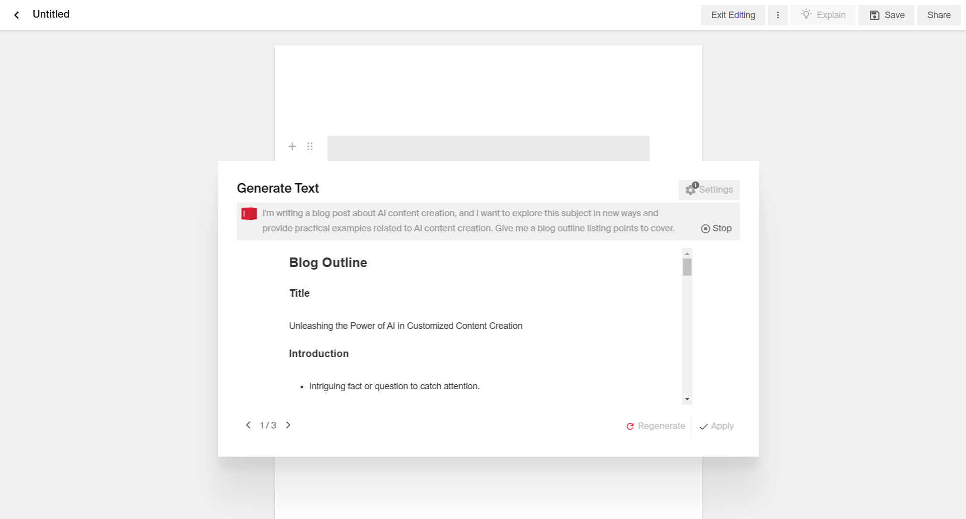 AI-generated outlines are great for organizing your thoughts, ensuring that you cover all relevant subtopics, and maintaining the logical flow of your post. If you're using the Typeface Blog Post template, the AI automatically generates a content outline based on the provided topic.