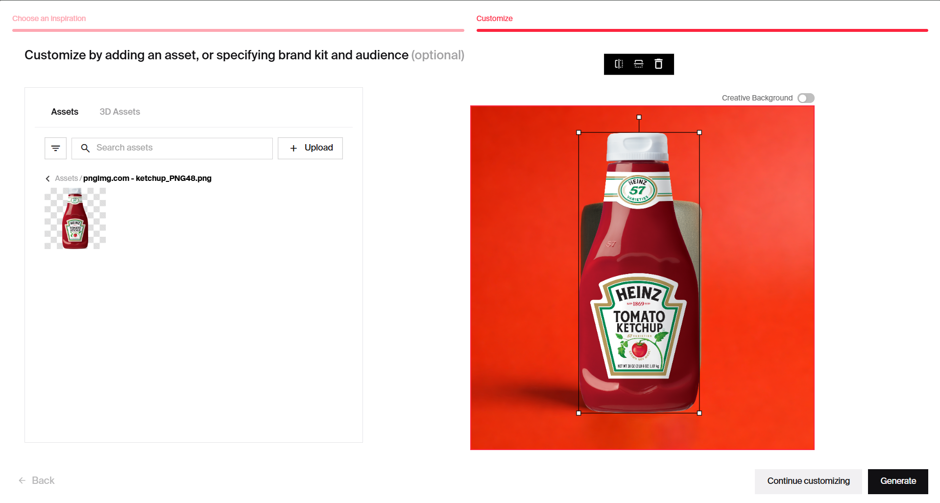 On-brand customization: The true power of this AI design platform lies in transforming your creative inspiration into on-brand designs. After selecting an inspiration image (or uploading one), you can easily integrate your own brand assets with a simple click and turn generic visual concepts into tailored, on-brand AI designs.