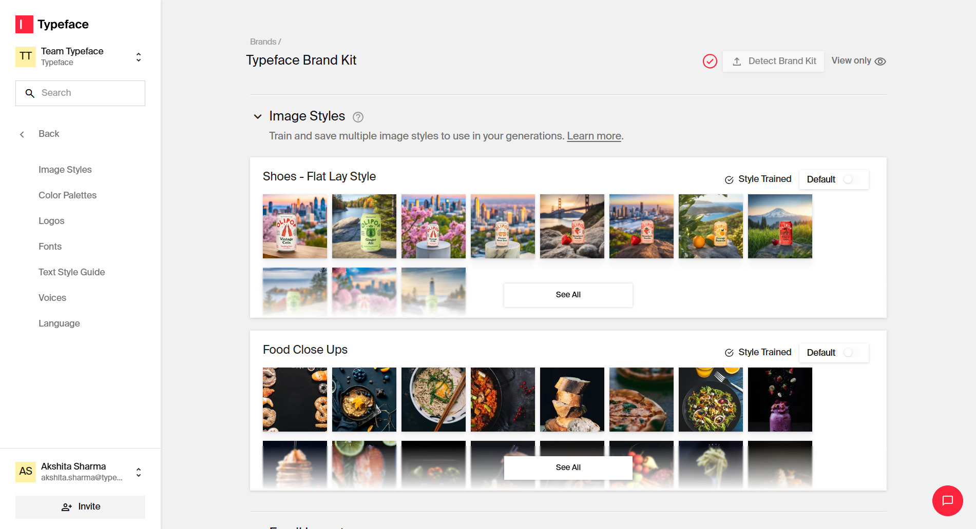 Modern AI design tools are capable of incorporating these standards directly into the generation process. Typeface, for example, centralizes all your brand elements like fonts, color palettes, logos, and even specific image styles learned through AI training in Brand Kits. This transforms static guideline documents into a dynamic system that guides the AI during content creation.