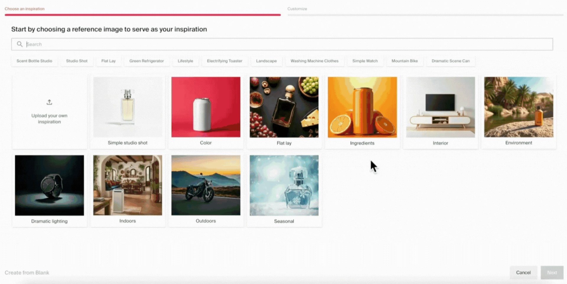 Inspiration Gallery: This feature provides access to a vast library containing thousands of pre-set, curated images for different product types, styles (e.g., studio shots, flat lays, lifestyle scenes), and compositions. This immediately provides visual direction, helps explore different creative avenues quickly, and reduces the need for costly and time-consuming initial photoshoots.