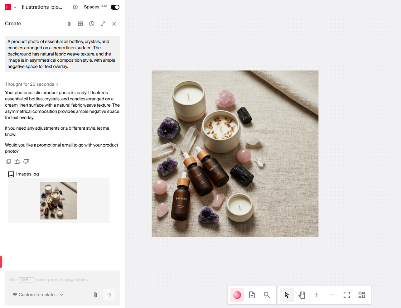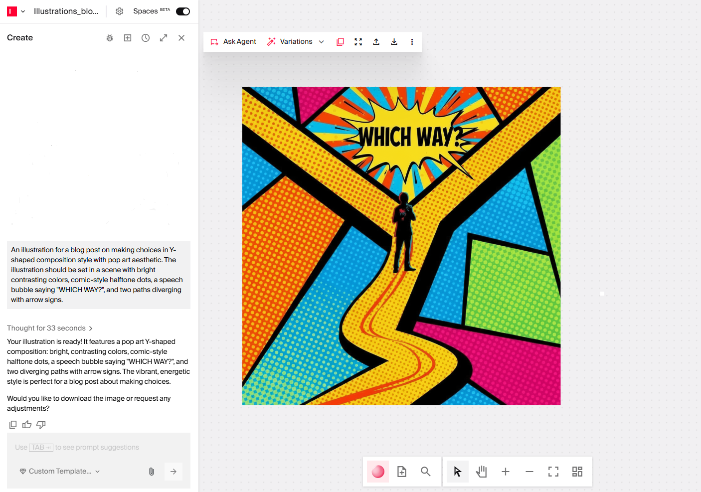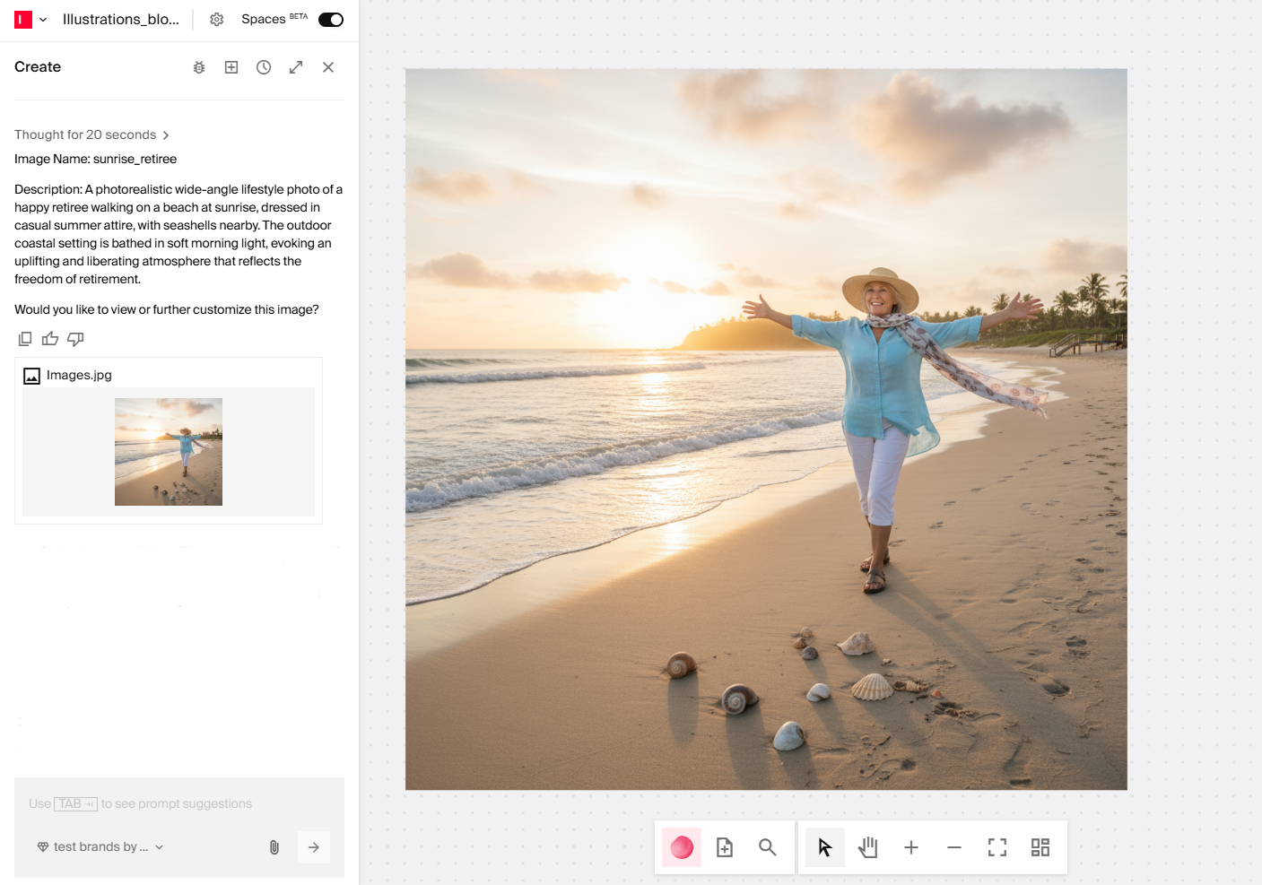 You create images by describing what you want, in everyday language. Rather than relying on designers for visuals every time, you direct an AI agent to create them. If the images must be refined by designers or shared as inspiration for a campaign, your teams can collaborate on one canvas.