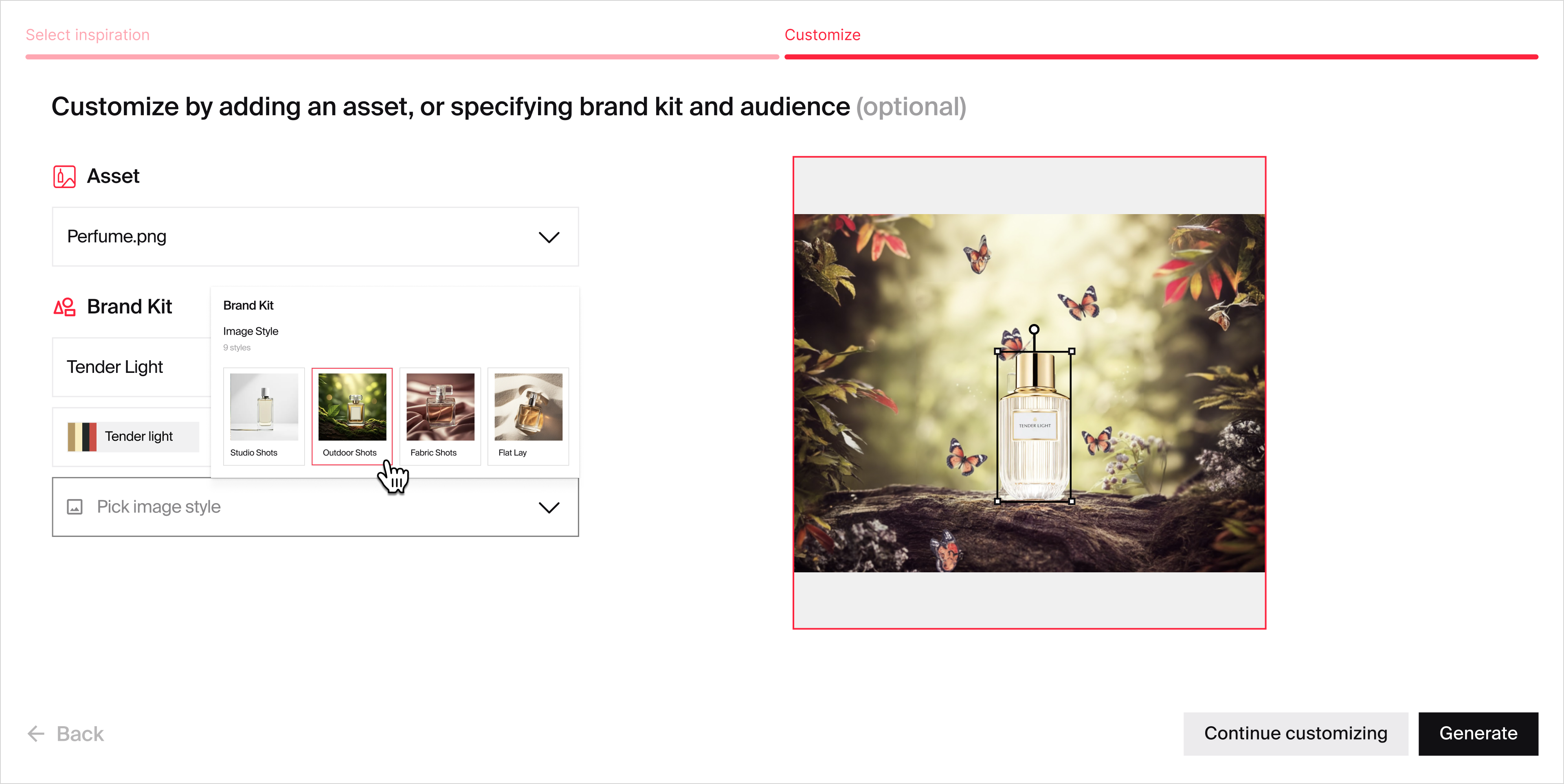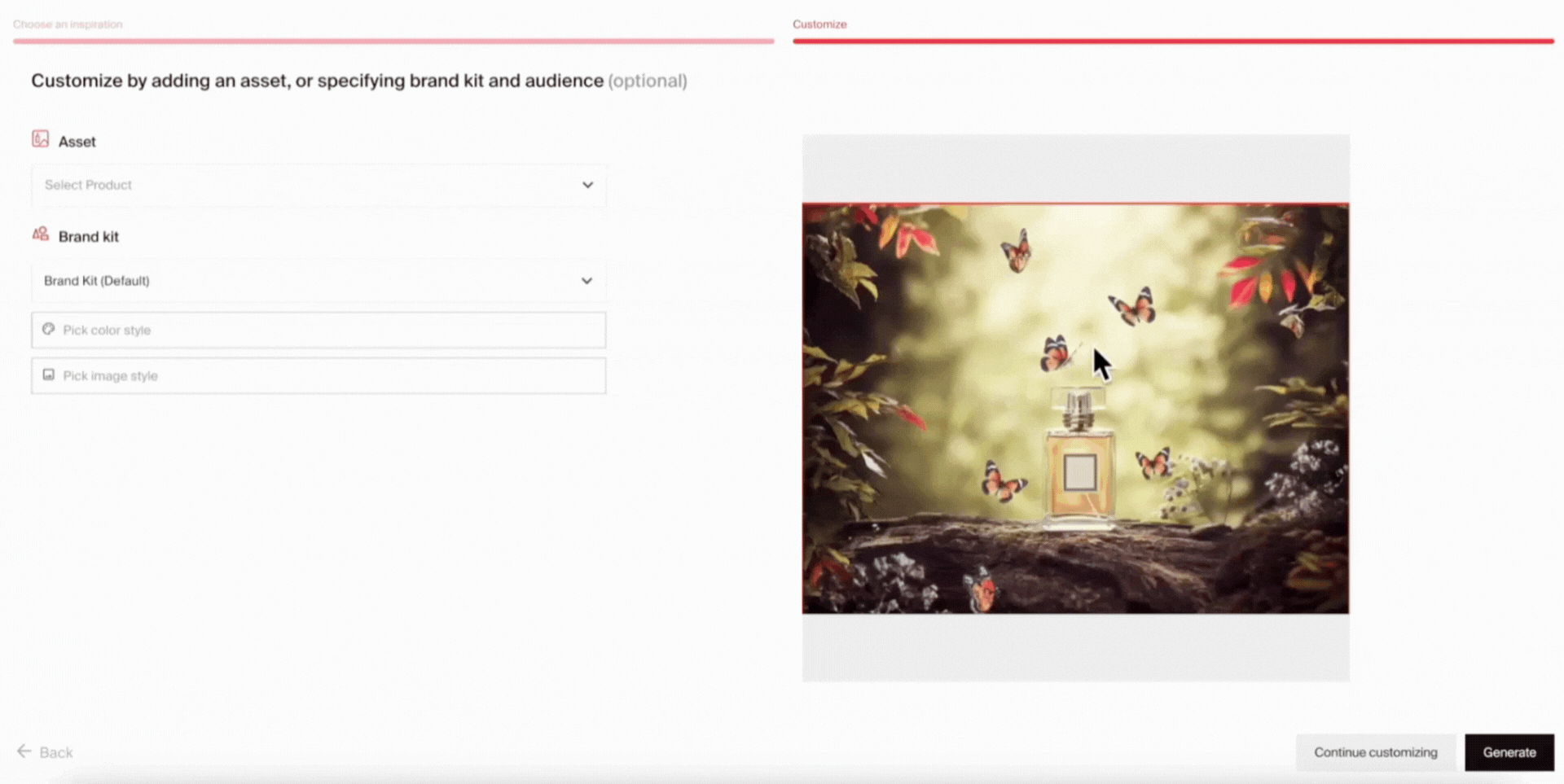 Apply your brand kit, adjust color palettes, and select image styles that reflect your brand's unique aesthetic. This crucial step turns the reference image into on-brand images that fit into your visual identity across all your marketing channels.