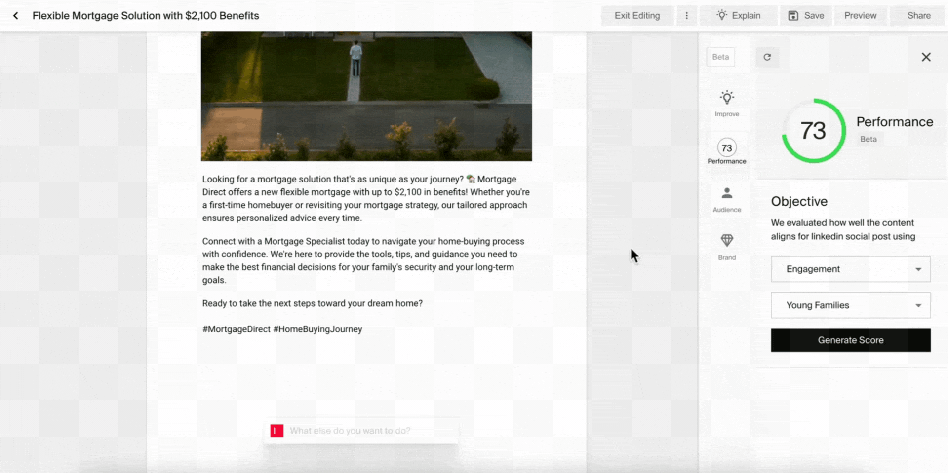 Proactive suggestions will appear next to your content to boost content performance. Under the “Improve” tab, you can see suggestions that range from channel-specific best practices to recommendations to increase audience engagement.