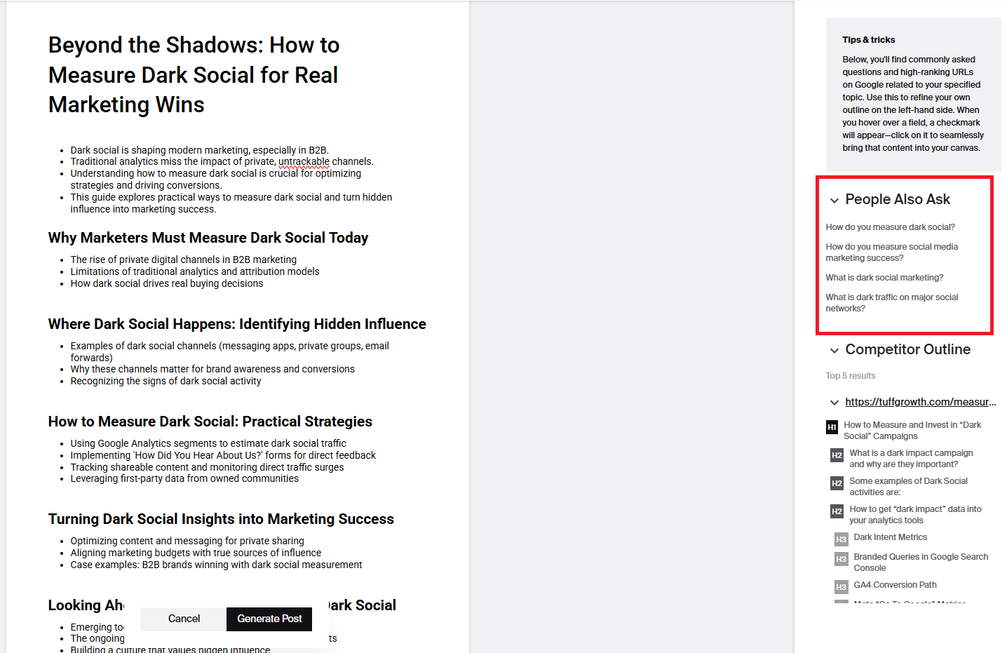 Even experienced writers spend hours crafting SEO-optimized blogs. Our AI simplifies this effort into an end-to-end SEO workflow by structuring blog outlines with optimized H1-H3 headers and suggesting primary and secondary keywords for your target market. In addition, it provides People Often Ask questions, competitor outlines, and keywords, enabling you to create well-structured, SEO-optimized blogs rapidly, which you can publish directly to your CMS through built-in connectors.
