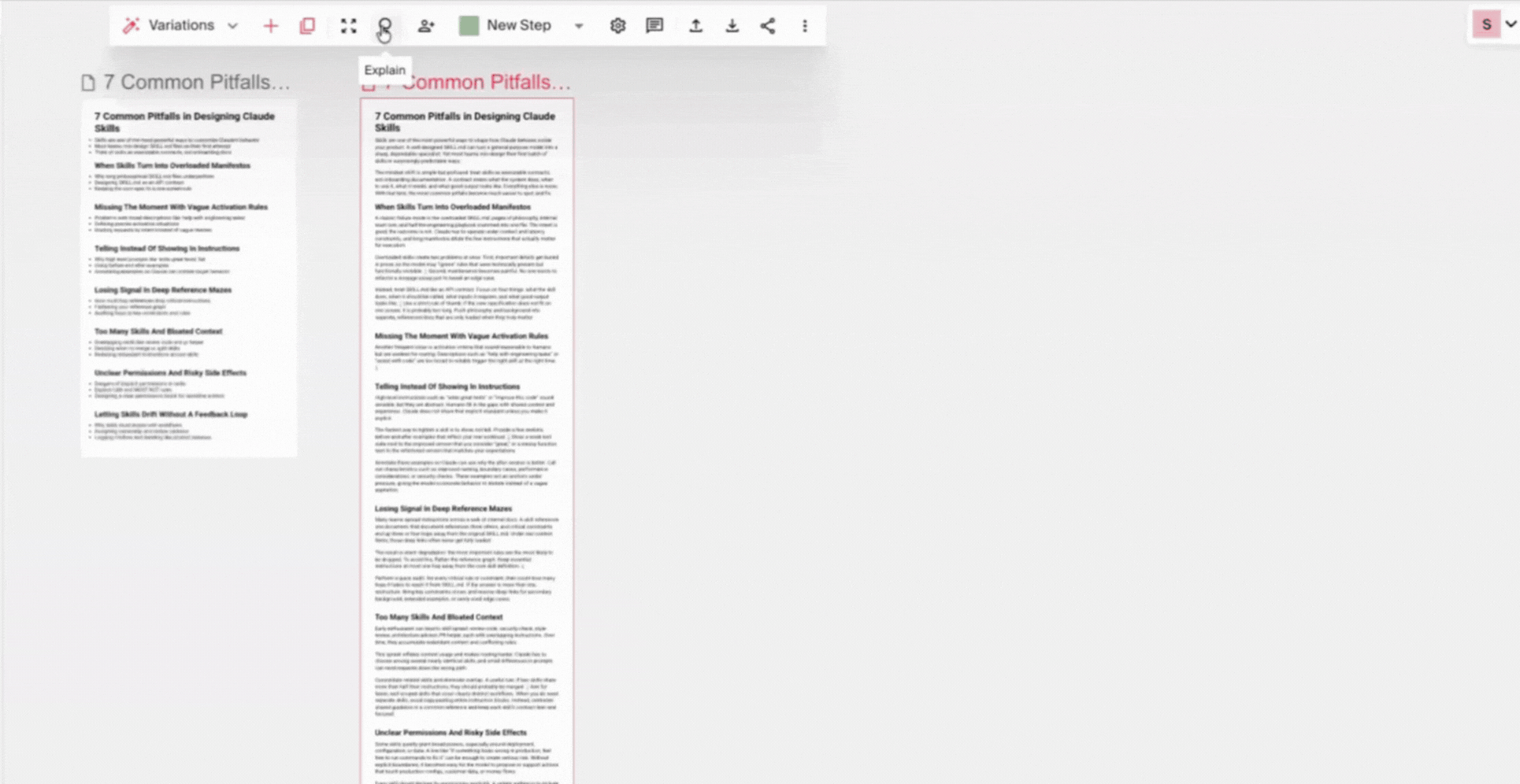 Explain panel: Open any blog, press release, webpage, or document and navigate to the Explain panel to see your AEO dashboard.