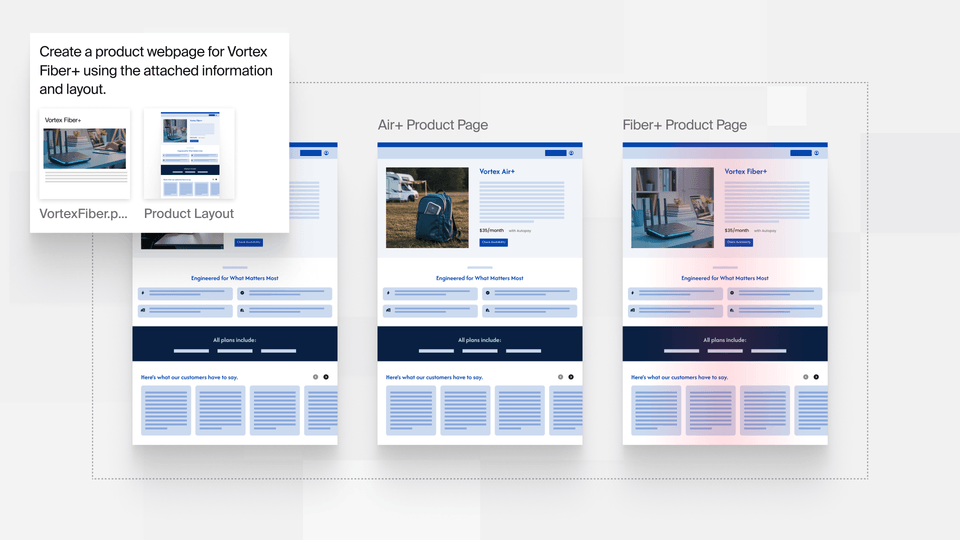 Accelerate production cycles from weeks to minutes: Need product pages for your entire catalog or hundreds of location-specific pages? Describe it, and Web Agent delivers complete previews that match your brand guidelines and layouts.