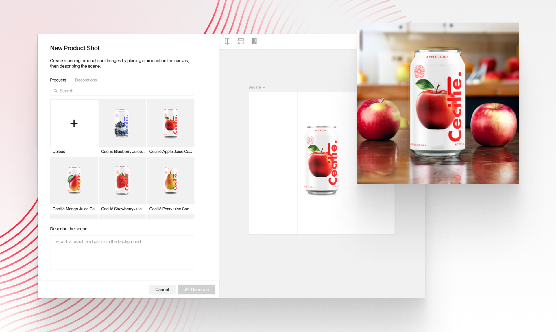 Describe the scene around your product and choose from pre-made decorations.