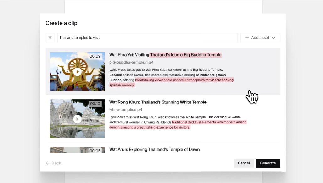 To start, open a document within the same project as your video. Add a video block. Then, within the search bar, look for a specific phrase (e.g. “AI impact on education”) related to part of your video. You’ll then receive the video clips. Click “Create clip” on the video clip of your choice. Using natural language search, you can quickly select key moments or messages to highlight in your social media clips.