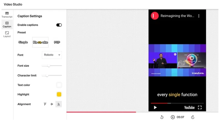 It’s common for social media clips to have captions. You can add these under the Caption section by clicking on “Enable captions.” Choose from a variety of stylization options, such as the “Karaoke” effect to get a word-by-word highlight of the speech.
