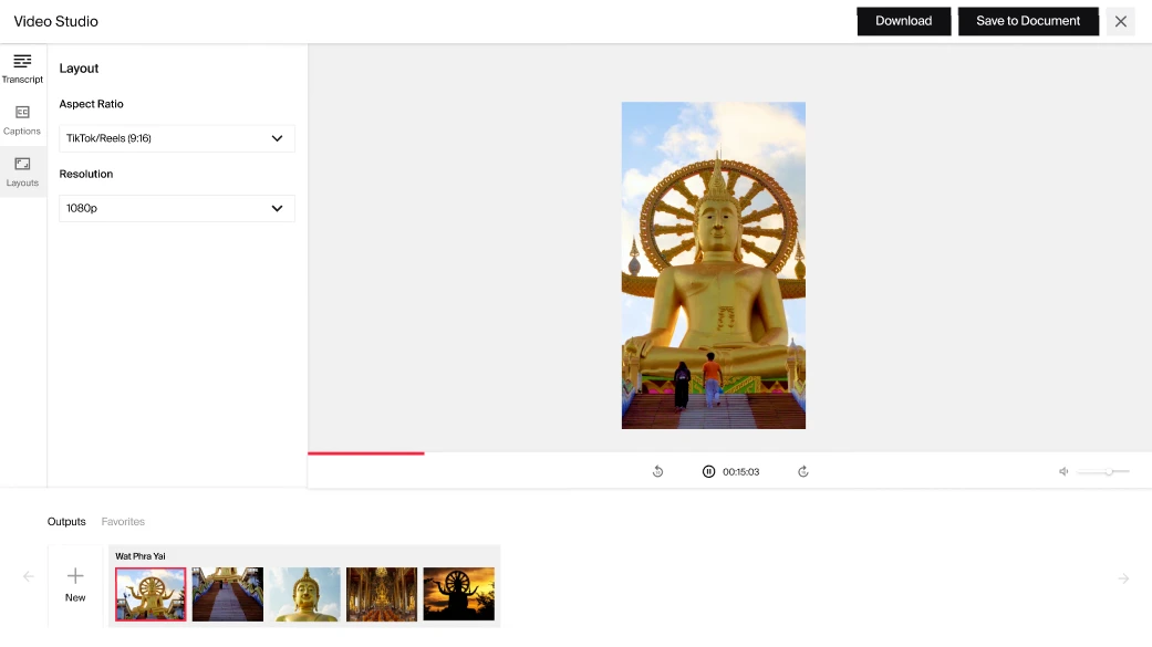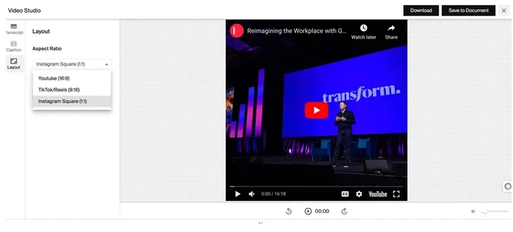Under Layouts section, you can adapt your video clip to various social platforms. Typeface will automatically adjust the aspect ratio to the specific social platform.