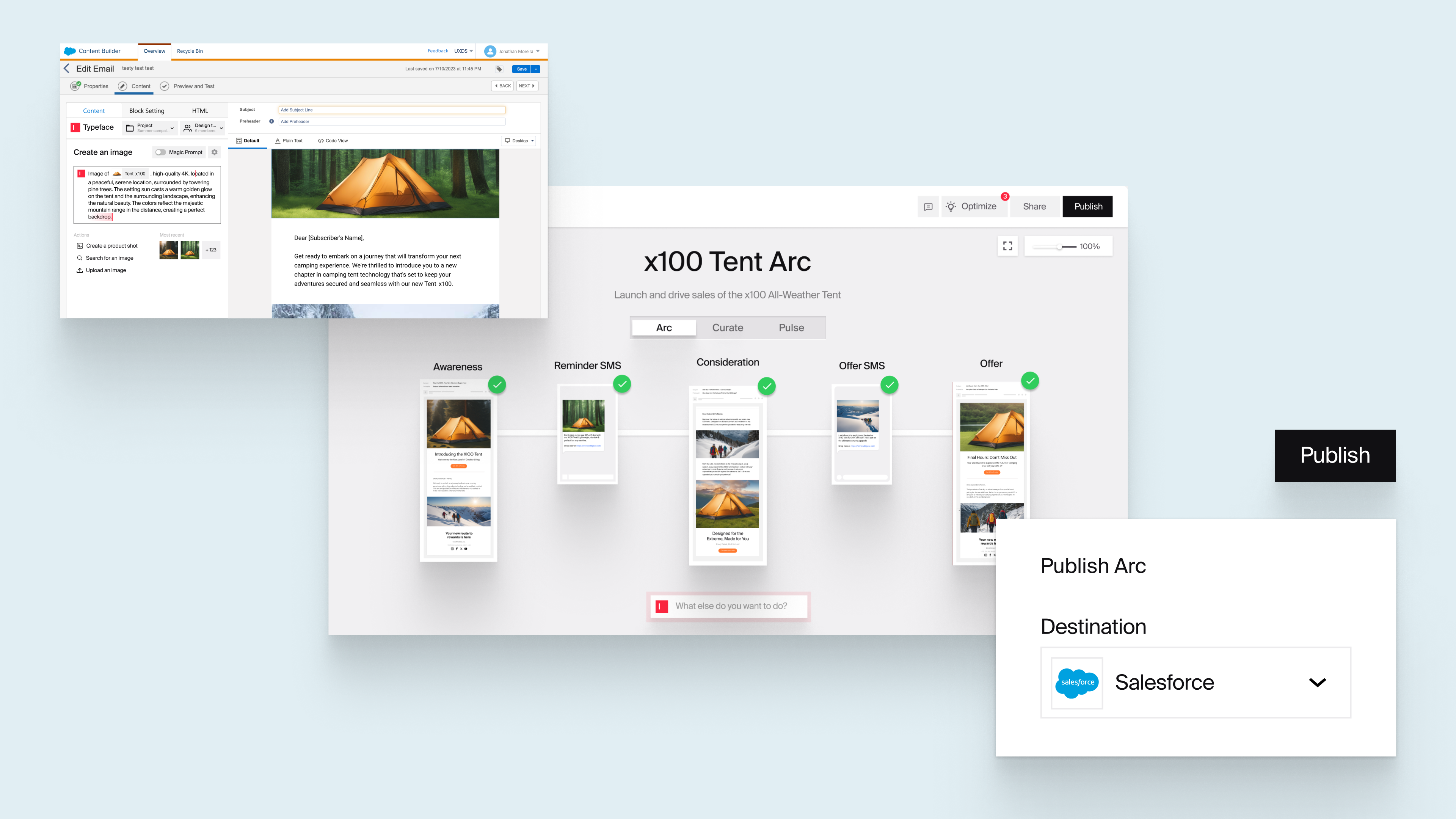 Journey Builder: Skip the step-by-step content creation. Arc lets you create new journeys or import pre-configured journeys from Journey Builder. Create content that is targeted for each stage of the journey, from welcoming new subscribers to re-engaging dormants.