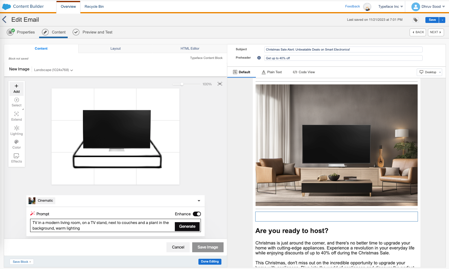 At Dreamforce, we introduced the Typeface experience in Salesforce Marketing Cloud, designed to simplify personalized content creation for marketers. Today, we're excited to announce that it's now available on Salesforce AppExchange. This update includes new collaboration controls for teams and a richer image generation experience through our Image Studio. We also added a new set of safety checks and guardrails so that brands can trust Typeface's generative AI to create content that is in line with their values.