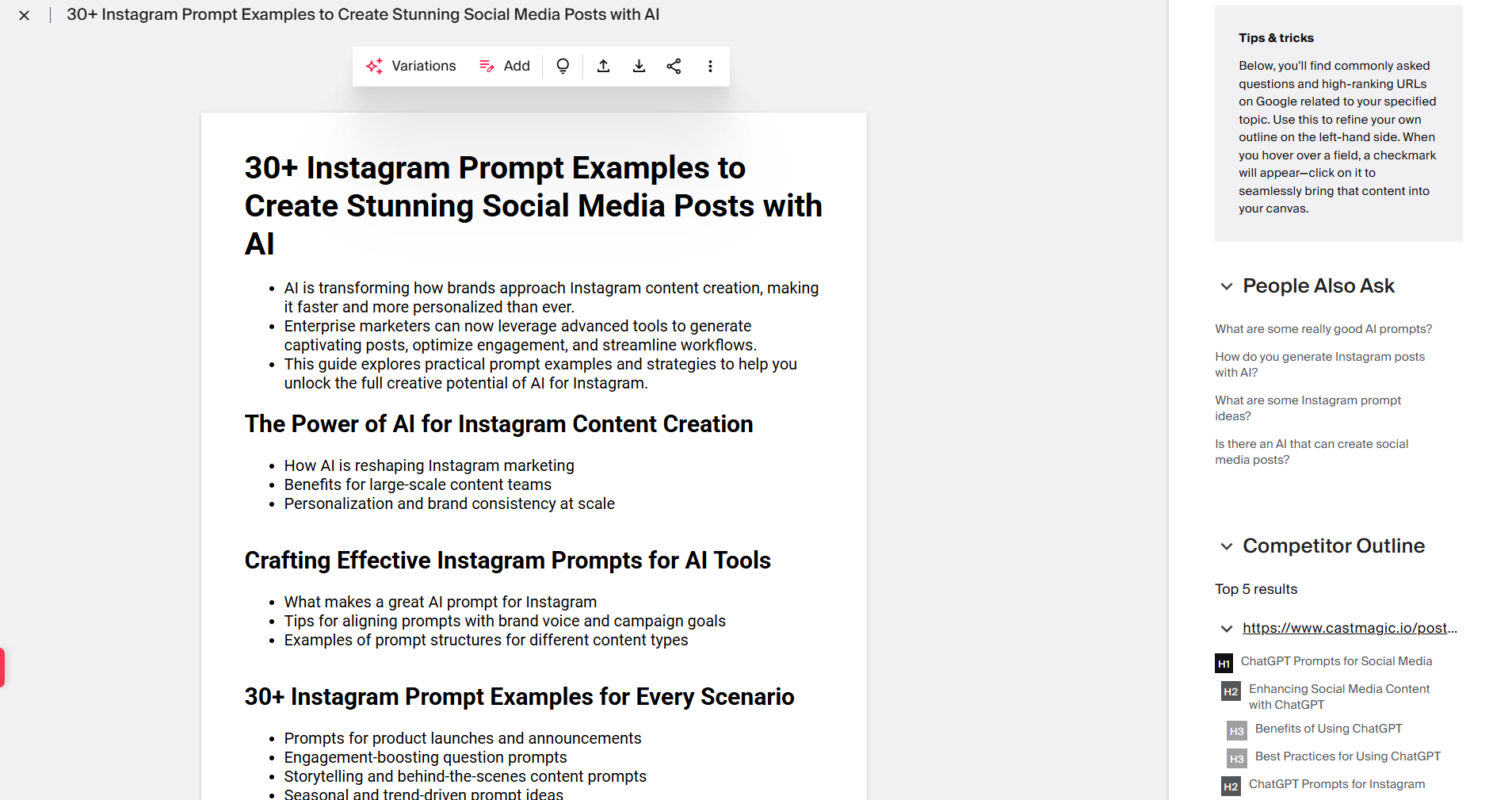 If you're using Typeface, the Web Agent streamlines this process by providing smart research assistance directly within your workflow. It automatically surfaces relevant questions from Google's "People Also Ask" (PAA) section and pulls content outlines from high-ranking URLs related to your topic. You can quickly review these suggestions to understand what queries your target audience is asking and identify content gaps you can fill.