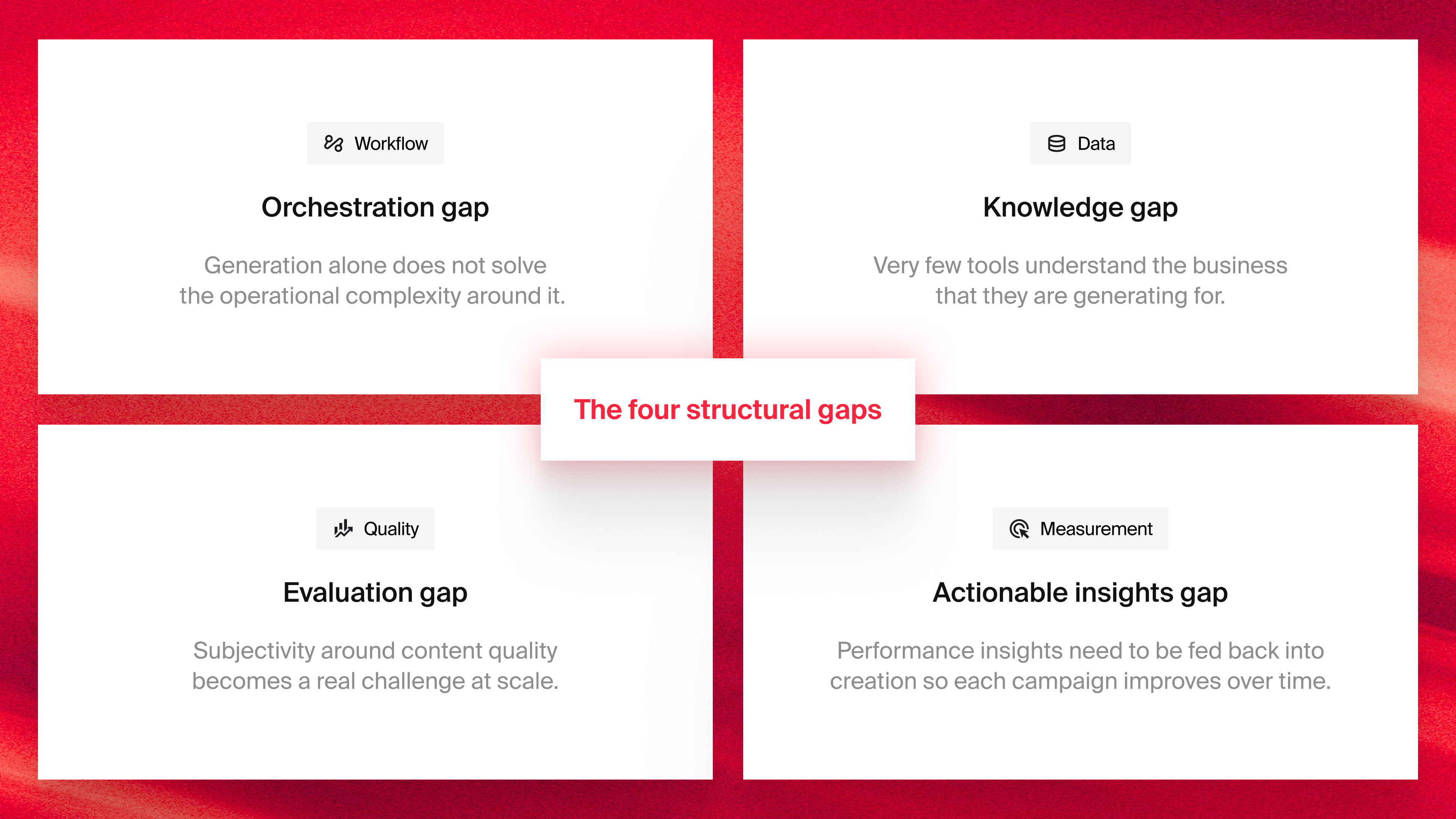 Knowledge gap: Most tools can generate content. Very few generate from the full business context. Brand voice, product details, audience nuance, channel requirements, and regulatory constraints are often disconnected from the creation process.